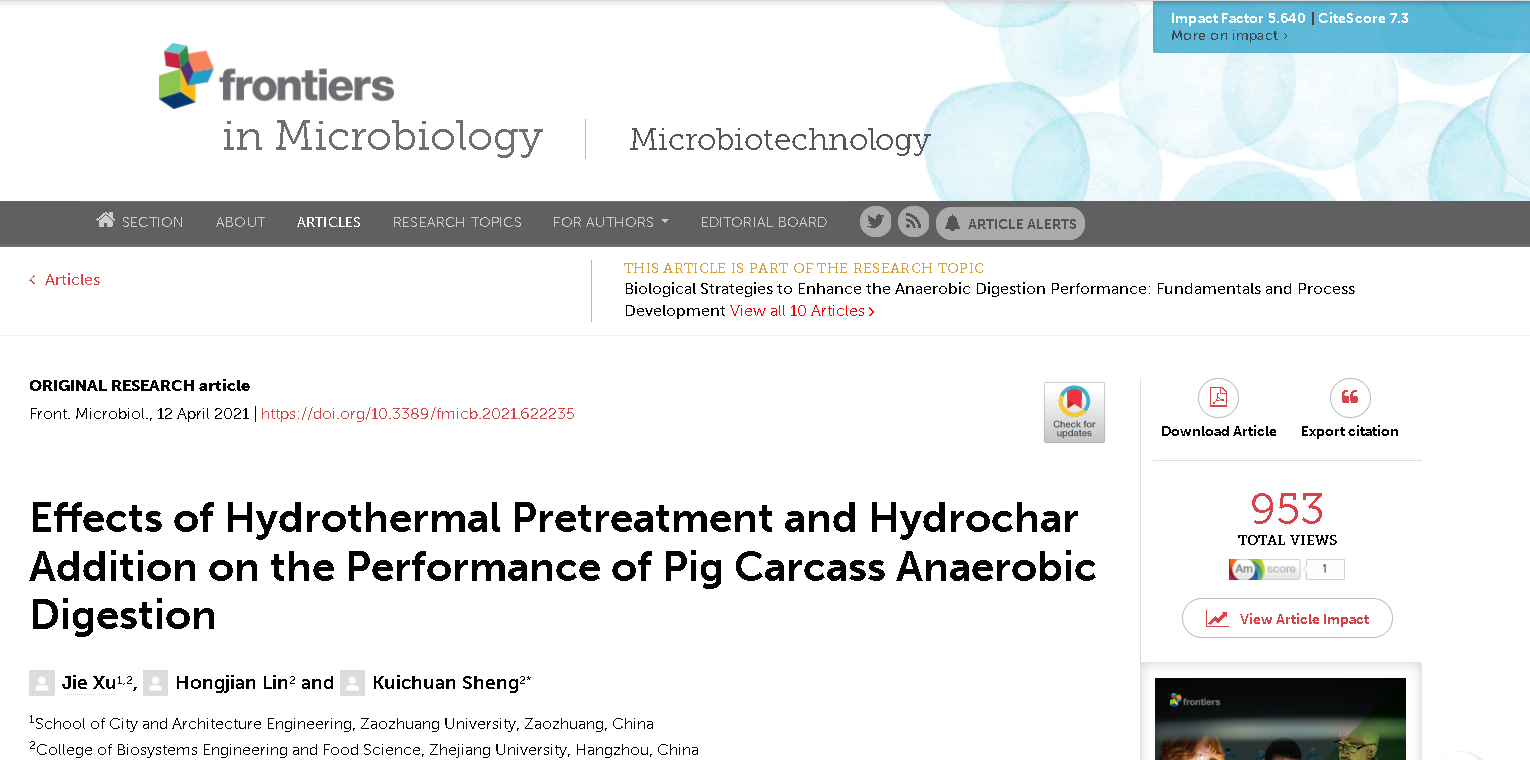 近日,beat365正版唯一入口必一固废资源化综合利用科研小组在水热炭调控厌氧消化研究方面取得最新进展,相关工作发表在国际著名期刊《Frontiers in Microbiology》(中科院一区,TOP期刊,影响因子5.640)上,论文题目为《Effects of hydrothermal pretreatment and hydrochar addition on the performance of pig carcass anaerobic digestion》,beat365正版唯一入口必一为第一单位,徐杰博士为论文第一作者。