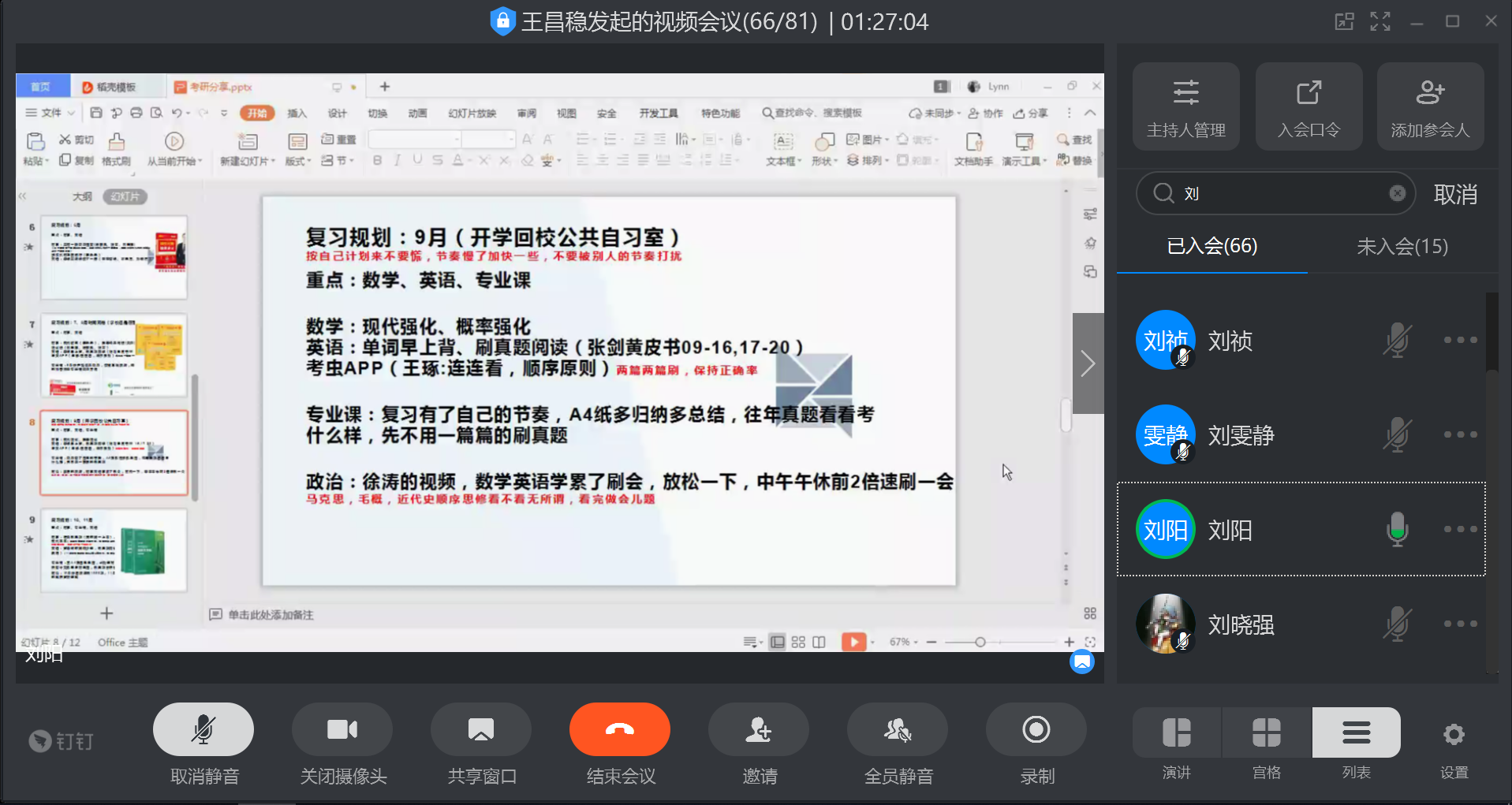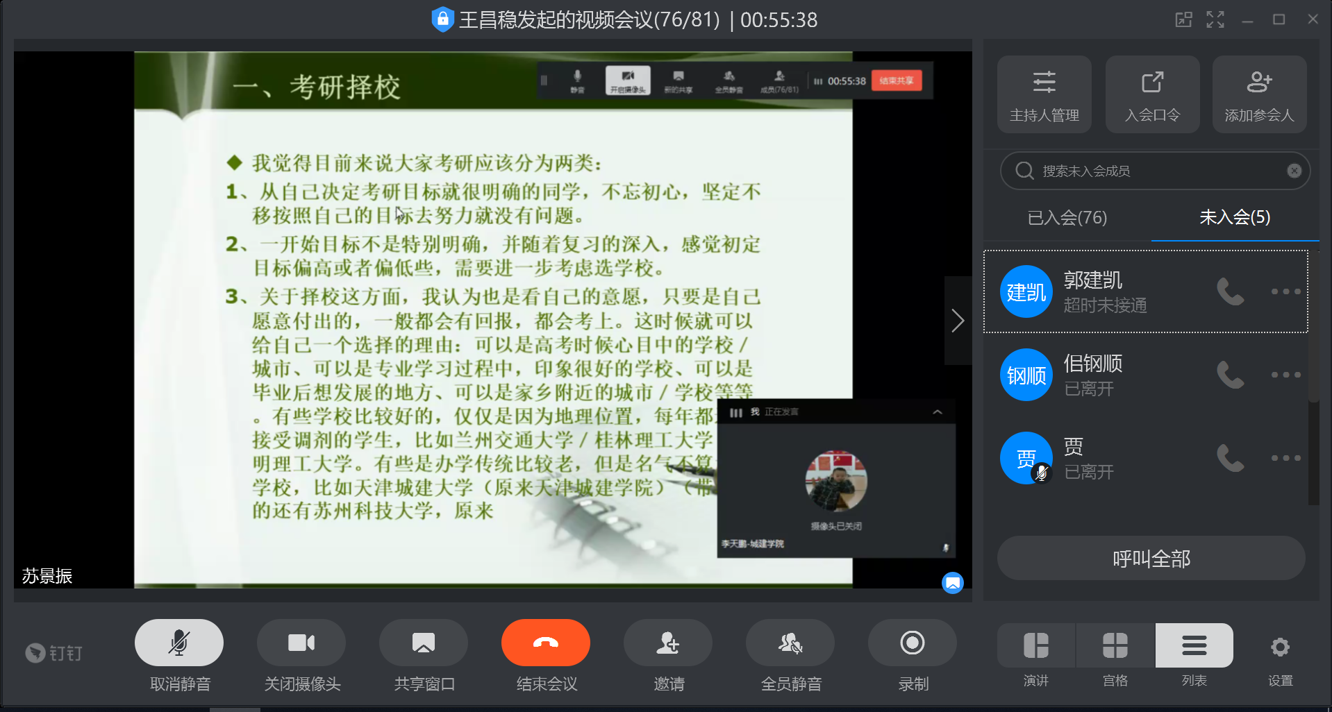 2020年6月17日上午9:00-10:30,beat365官网给排水科学与工程专业采用钉钉视频会议的形式组织召开了2017级考研动员会(既经验交流会)。给排水科学与工程专业全体教师、2017级全体同学及2018、2019级部分同学参加此次视频会议。