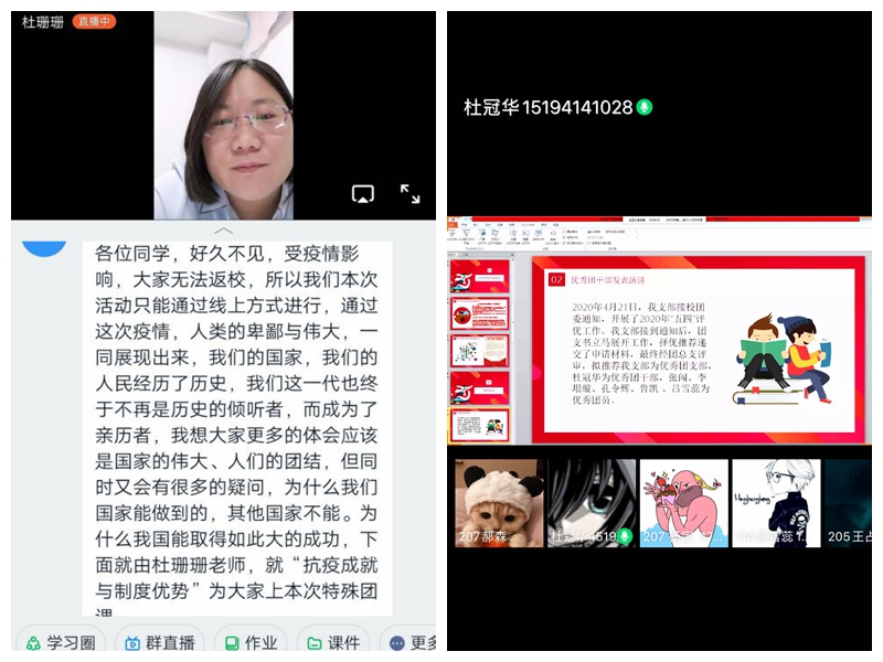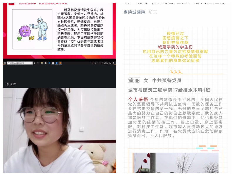 为确保全面准确做到“五个讲清楚”,保证思想引领作用落到实处,引导青年学生进一步坚定制度自信,团总支副书记杜珊珊利用钉钉为beat365官网学生会干部、各班团支部书记围绕抗疫成就与制度优势开展网上团课;在认真完成青年大学习集中学习的基础上,又结合beat365官网工作实际与专业倾向,各团支部书记组织召开网上主题团日活动;各团支部在五四评优中获得“优秀团干”称号、被评为青春战“疫”优秀青年志愿者的同学也通过钉钉或QQ群开展宣讲报告、故事分享等学习宣传活动,向大家分享自己的心得;利用“枣院城建院”微信公众平台,开展网络知识竞赛,以此夯实同学们思想基础建设,提升理论学习的思想性、亲和力和渗透度;向全体同学发出倡议“呼吁同学们加入到志愿者的行列中来,持续深入开展疫情防控志愿服务工作”,在做好自身安全防护的前提下,依法科学有序参与疫情联防联控,为坚决遏制疫情扩散、夺取防控斗争胜利贡献青春力量;结合疫情防控实际推荐优秀抗疫志愿者作为入党积极分子候选人。