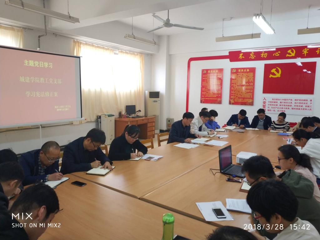 为了进一步学习贯彻习近平新时代中国特色社会主义思想、党的十九大、十九届三中全会和两会精神,落实依法治国方针,加强教师、党员师生法制观念,依法治学,依《beat365正版唯一入口必一章程》办学,城建学院在3月28日下午,利用“双周三主题党日”组织开展学习《中华人民共和国宪法修正案》。党总支书记李振清主持会议。
