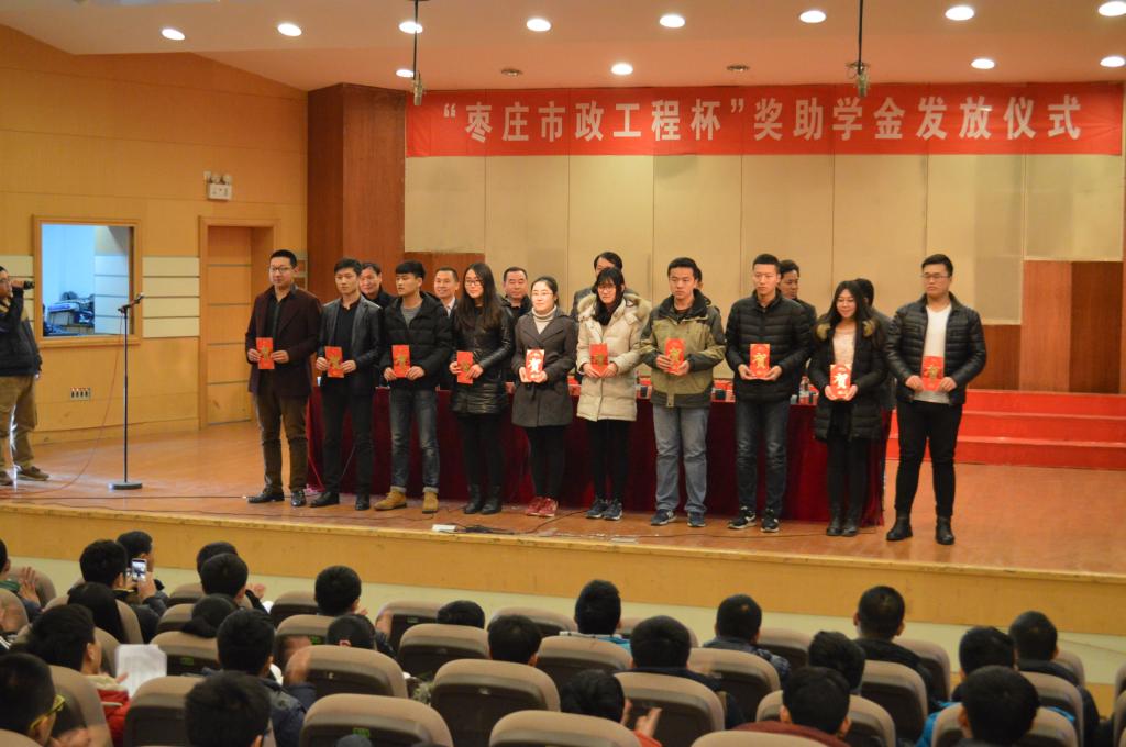 “枣庄市政工程杯”“基金”旨在帮助贫困大学生完成学业,由枣庄市政工程股份公司出资赞助4万元,用于奖励学习成绩优秀和家庭经济困难的学生。经过学院和企业认真审核,最终确定二十名品学兼优的学生作为本届“枣庄市政工程杯”奖助对象。