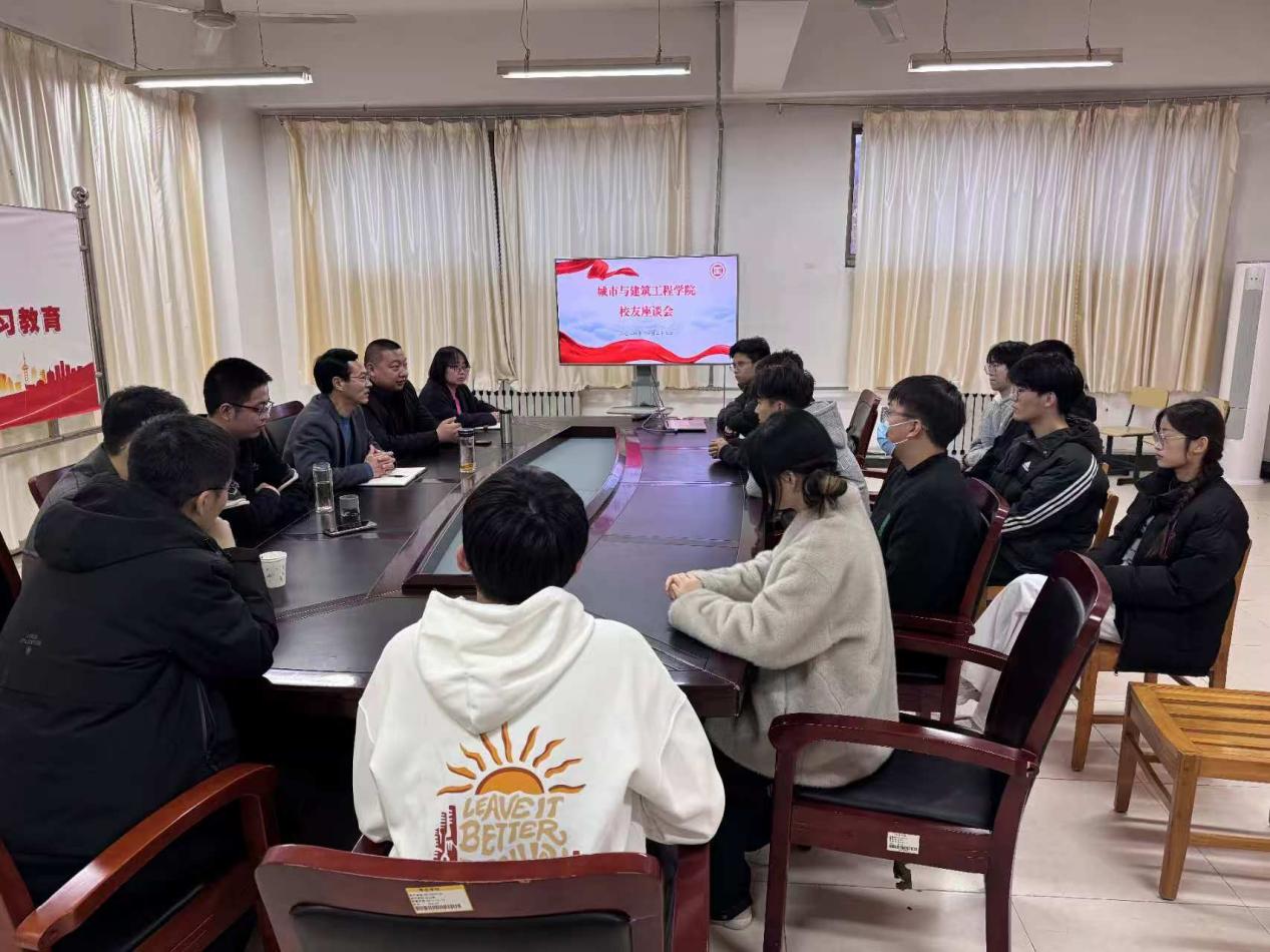为搭建在校学生与优秀校友沟通交流的桥梁,发挥榜样的引领示范作用,激励广大学子明确学习目标,规划未来发展方向,11月23日,beat365官网邀请优秀校友代表何腾、于海波一行来学院座谈交流,学院党委副书记胡新华主持,学院团委书记裴娴哲、辅导员刘成河、2021级和2022级学生代表参加活动。