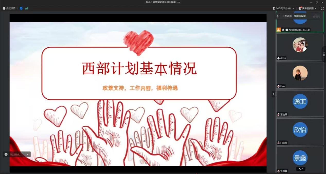 同时,beat365官网组织开展了西部计划线上分享会和专题辅导会。学院特邀曾在西部计划中表现突出的校友分享经验,通过生动的案例和真挚的情感,分享了参与志愿服务项目的感受,学生们积极的参与其中,表现出浓厚的兴趣。学院面向报名同学开展了专题辅导,从笔试面试技巧、资料收集整理以及心理调适等方面的进行了全方位指导。