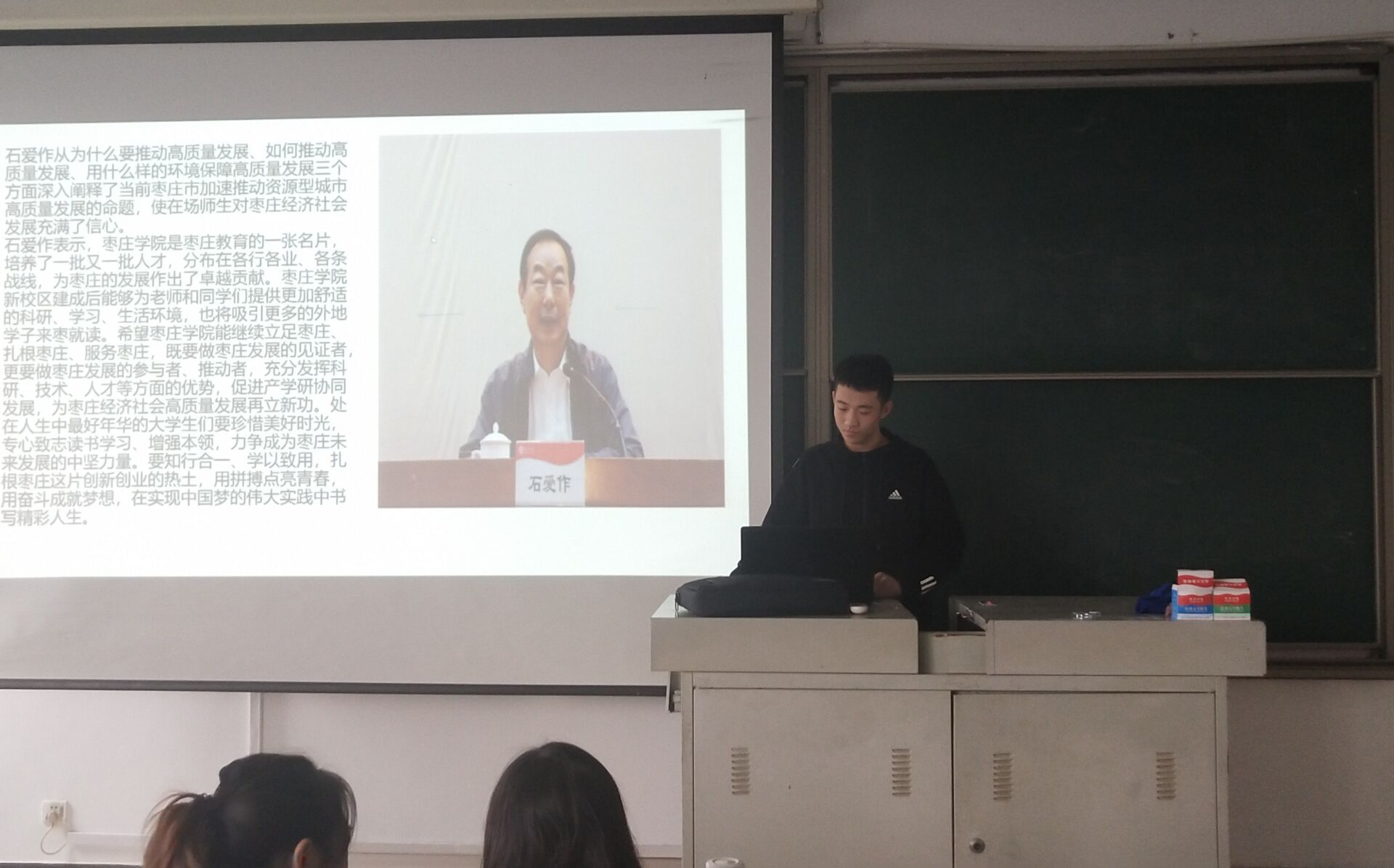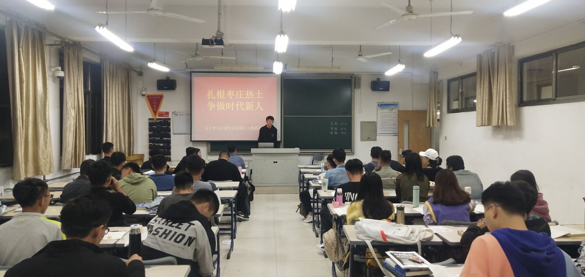 各团支部认真学习了石市长的讲话,对报告会上石市长向大学生提出的“知行合一、学以致用,扎根枣庄这片创新创业的热土,用拼搏点亮青春,用奋斗成就梦想,在实现中国梦的伟大实践中书写精彩人生”的殷切希望和要求,展开了热烈讨论。在讨论中,学生纷纷表示,要立足学生本职,学好专业知识,怀抱理想,勇于创新,扎根枣庄热土,保持永不懈怠的精神状态和一往无前的奋斗姿态,努力实现自己的人生梦想。