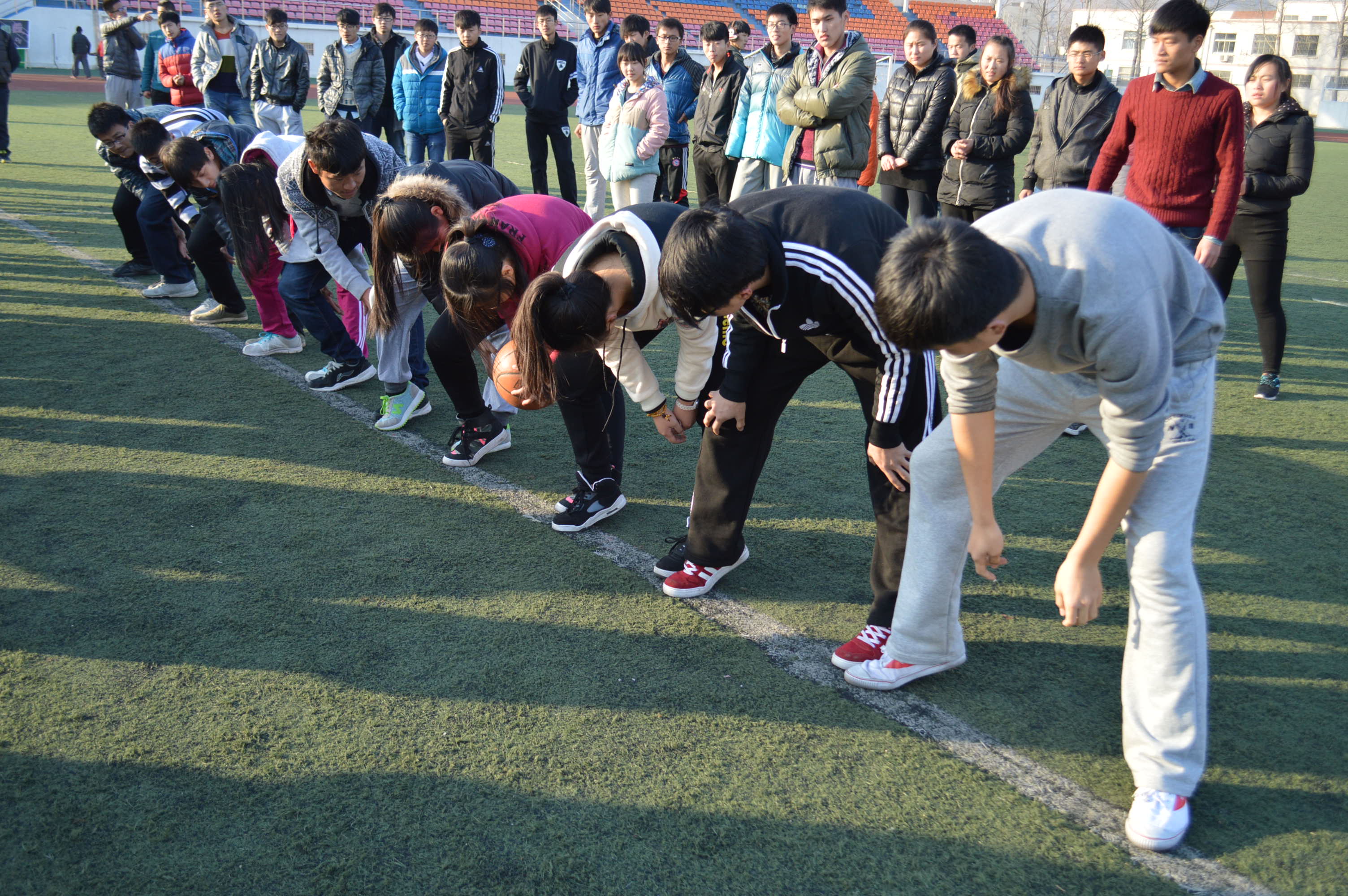 此次运动会吸引了众多新生的积极参与,场面异常热烈。运动会共分为田径类和趣味类两个模块,比赛项目丰富多彩,其中田径类包括100米、400米、4*100米接力赛、背抛实心球、跳远等项目;趣味类包括十人十一足、穿越火线、背夹球等。在比赛中,选手们奋勇向前、努力拼搏的精神不断感染着看台上的每一位同学。100米、400米、跳远等比赛项目让同学们懂得了在生活中如何去拼搏,在困难中如何去坚持,寒烈的冬风,挡不住他们破竹的锐气;充满童趣的“穿越火线”将同学带回到美好的童年,勾起了童年的美好回忆;4*100米接力赛、十人十一足、背夹球项目建立起同学之间的默契,让同学认识到了配合的重要性,诠释着团队的精神。运动会后,同学们大汗淋漓,脸上却绽放出美丽的笑容。