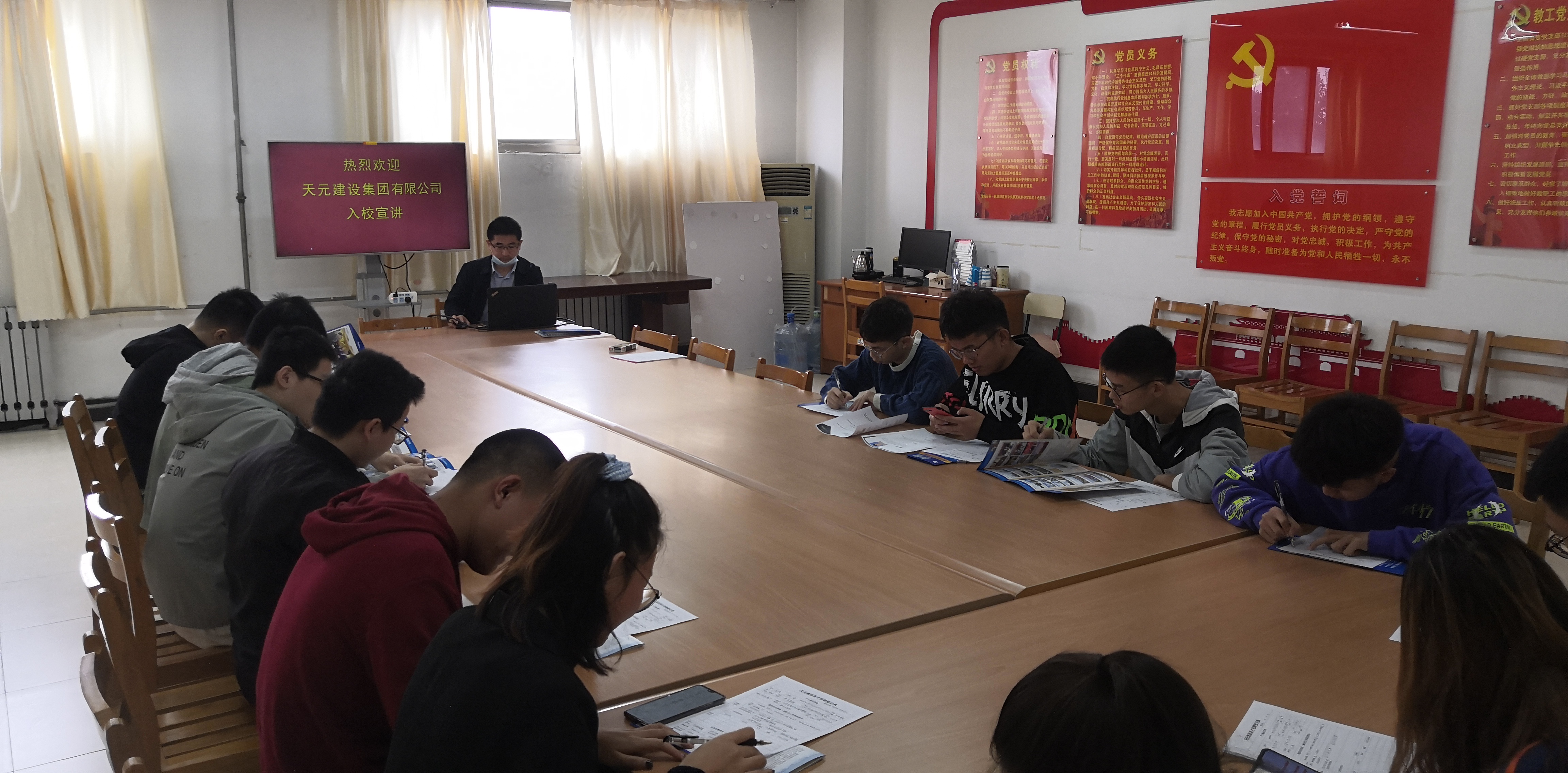 招聘会上,山东天元集团通过播放宣传片、PPT展示、面对面交流等方式向同学们介绍公司概况、职业的发展方向、人员需求以及选择该单位的理由等。