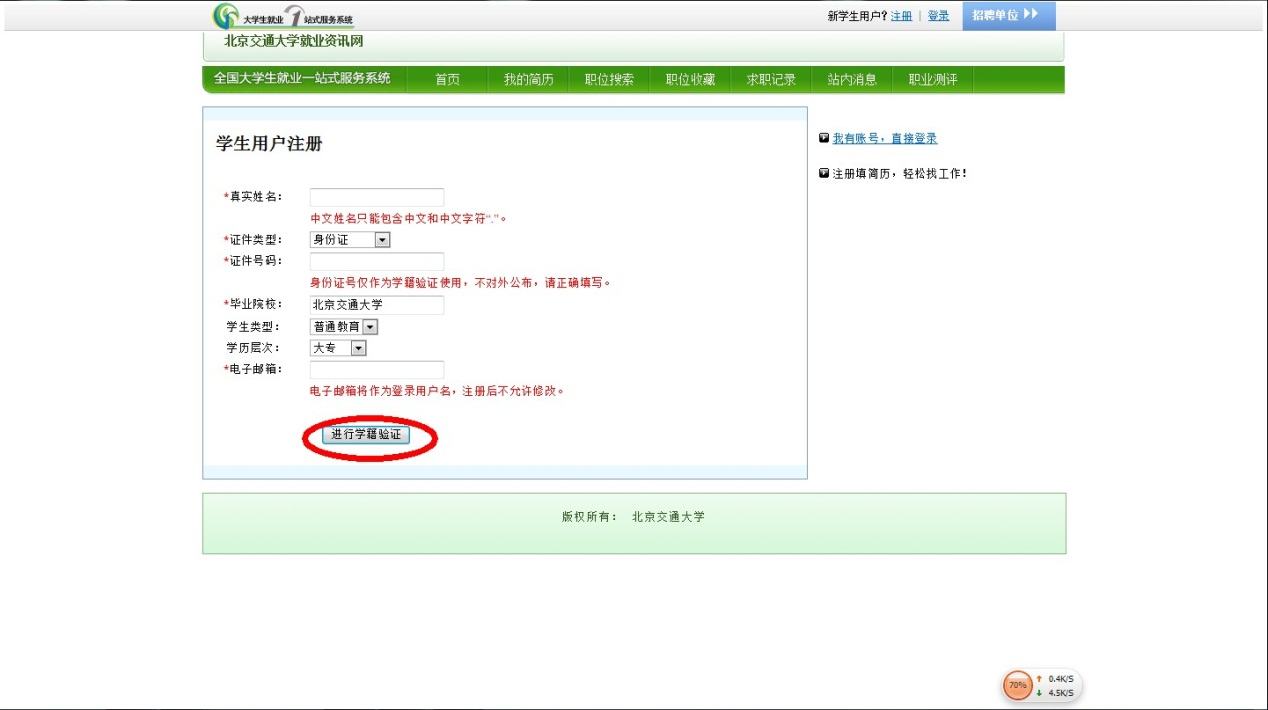 3、在页面右下角,点击“快速注册”,然后按照页面要求填写真实信息,最后点击“进行学籍认证”。然后再设定密码。认证结束后,返回注册之前的页面。