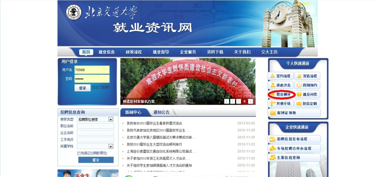 1、输入job.bjtu.edu.cn,在页面右上部“个人快捷通道”中点击“职业测评”。